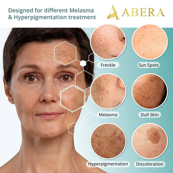 Professional Ingredients: Abera Melasma Serum is formulated with a meticulously crafted blend of Genowhite, Niacinamide, Bee Venom Extract, Hyaluronic Acid (HA) effectively penetrates deep into the skin to reduce melanin pigments that cause melasma.